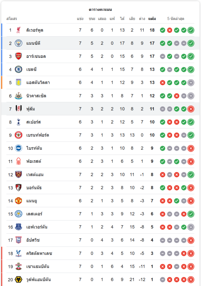 หลังจากชนะนัดนี้ แมนเชสเตอร์ ซิตี้ เก็บเพิ่ม 3 คะแนน ทำให้พวกเขามี 17 คะแนน ขยับขึ้นมาอยู่อันดับที่ 2 ตามหลังจ่าฝูงอย่าง ลิเวอร์พูล เพียงแค่ 1 คะแนน ขณะที่ ฟูแล่ม ยังคงอยู่ในอันดับที่ 7 ด้วยคะแนน 11 แต้มจากการลงเล่น 7 นัด