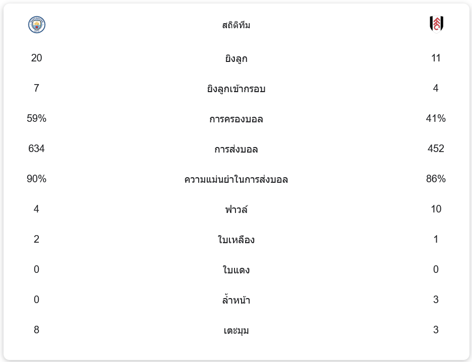 - แมนเชสเตอร์ ซิตี้ ครองบอลถึง 59% ในขณะที่ ฟูแล่ม ครองบอลเพียง 41%
