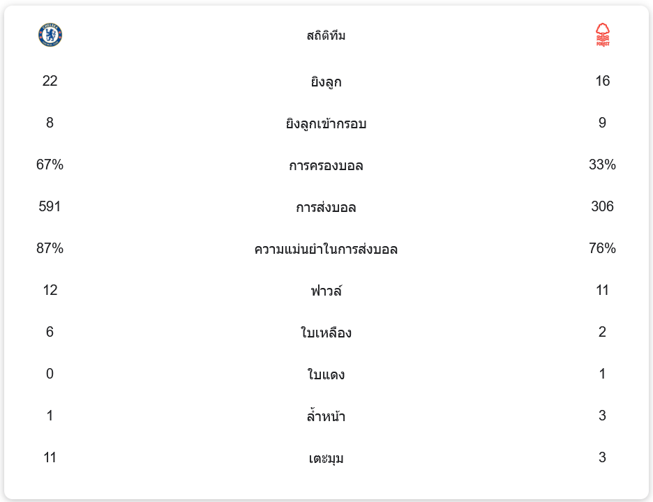 เชลซี มีโอกาสยิงทั้งหมด 22 ครั้ง โดยยิงเข้ากรอบ 8 ครั้ง ขณะที่ ฟอเรสต์ ยิงทั้งหมด 16 ครั้ง ยิงเข้ากรอบ 9 ครั้ง เชลซีครองบอลได้มากถึง 67% ส่วนฟอเรสต์ครองบอลได้เพียง 33% เชลซีมีการส่งบอลทั้งหมด 591 ครั้ง ขณะที่ฟอเรสต์ส่งบอล 306 ครั้ง ความแม่นยำในการส่งบอลของเชลซีอยู่ที่ 87% ส่วนฟอเรสต์อยู่ที่ 76% นอกจากนี้ เชลซีทำฟาวล์ 12 ครั้ง และได้ใบเหลือง 6 ใบ ส่วนฟอเรสต์ทำฟาวล์ 11 ครั้ง ได้ใบเหลือง 2 ใบ และใบแดง 1 ใบ