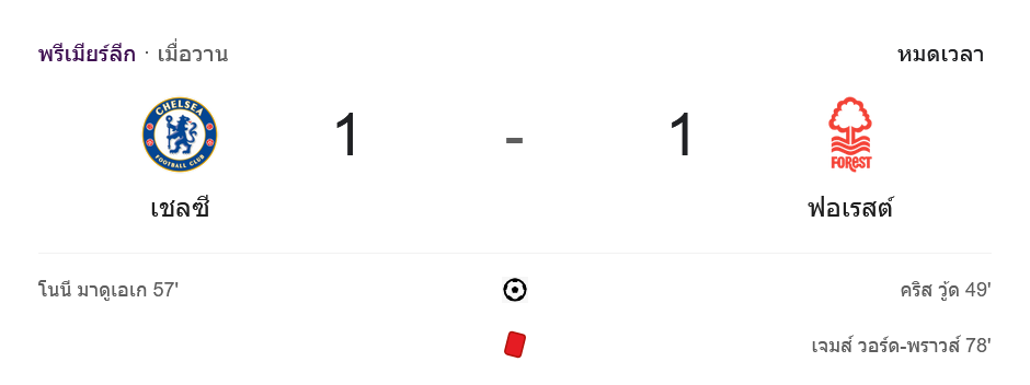 การแข่งขันฟุตบอล พรีเมียร์ลีก 2024 เมื่อคืนที่ผ่านมา เชลซี ทำได้เพียงเสมอกับ น็อตติ้งแฮม ฟอเรสต์ 1-1 ท่ามกลางความดราม่าทั้งการทำประตูและการโดนใบแดงในช่วงท้ายเกม แม้ว่าเชลซีจะครองเกมและสร้างโอกาสได้มากกว่า แต่ฟอเรสต์ยังสามารถแบ่งแต้มออกไปได้จากความทุ่มเทและฟอร์มที่แข็งแกร่งของนักเตะ