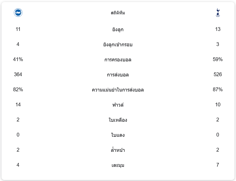 แม้ว่า ท็อตแน่ม ฮ็อทสเปอร์ จะครองบอลได้มากกว่าโดยมีอัตราการครองบอลถึง 59% แต่ ไบรท์ตัน กลับสร้างความอันตรายในจังหวะสวนกลับ ยิงเข้ากรอบถึง 4 ครั้งจากการยิงทั้งหมด 11 ครั้ง ส่วนสเปอร์สมีโอกาสยิงทั้งหมด 13 ครั้งแต่เข้ากรอบเพียง 3 ครั้ง นอกจากนี้ไบรท์ตันยังฟาวล์มากถึง 14 ครั้งและได้ใบเหลือง 2 ใบ ขณะที่สเปอร์สฟาวล์ 10 ครั้งและได้ใบเหลือง 2 ใบ