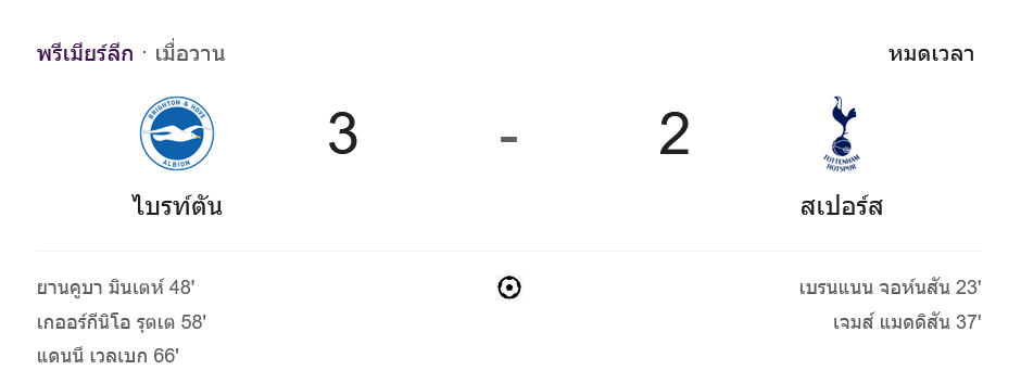 การแข่งขัน พรีเมียร์ลีก 2024 คู่ดุเดือดระหว่าง ไบรท์ตัน โฮฟ อัลเบี้ยน กับ ท็อตแน่ม ฮ็อทสเปอร์ จบลงด้วยชัยชนะของเจ้าบ้านไบรท์ตันที่สามารถฮึดกลับมาเอาชนะท็อตแน่ม ฮ็อทสเปอร์ได้อย่างสุดมันส์ 3-2 หลังจากที่สเปอร์สนำก่อนในครึ่งแรกถึง 2-0 แต่ไบรท์ตันไม่ยอมแพ้ จัดการทำสามประตูในครึ่งหลังเพื่อคว้าสามแต้มสำคัญในบ้าน