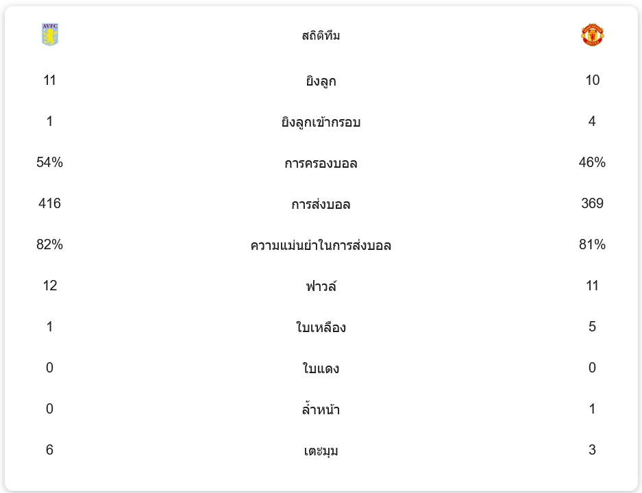 เกมนี้ แอสตัน วิลล่า มีโอกาสยิงทั้งหมด 11 ครั้ง โดยที่ยิงเข้ากรอบเพียง 1 ครั้ง ขณะที่ แมนเชสเตอร์ ยูไนเต็ด ยิงทั้งหมด 10 ครั้ง เข้ากรอบ 4 ครั้ง การครองบอลของวิลล่าอยู่ที่ 54% ส่วนแมนยูครองบอล 46% ฝั่งวิลล่ามีการส่งบอลทั้งหมด 416 ครั้ง ความแม่นยำในการส่งบอลอยู่ที่ 82% ส่วนแมนยูส่งบอล 369 ครั้ง ความแม่นยำ 81% ฝั่งวิลล่ามีการทำฟาวล์ 12 ครั้งและได้รับใบเหลือง 1 ใบ ขณะที่แมนยูฟาวล์ 11 ครั้งและได้ใบเหลืองถึง 5 ใบ