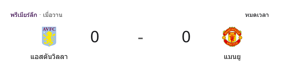 การแข่งขันฟุตบอล พรีเมียร์ลีก 2024 เมื่อคืนที่ผ่านมาเป็นการพบกันระหว่าง แอสตัน วิลล่า และ แมนเชสเตอร์ ยูไนเต็ด ซึ่งจบลงด้วยผลเสมอแบบไร้สกอร์ 0-0 ทำให้ทั้งสองทีมเก็บไปคนละแต้ม เกมนี้เต็มไปด้วยความตึงเครียดทั้งจากฝั่งของเจ้าบ้าน แอสตัน วิลล่า ที่ครองบอลได้มากกว่า และ แมนเชสเตอร์ ยูไนเต็ด ที่พยายามสร้างจังหวะสวนกลับอย่างต่อเนื่อง แต่ไม่มีทีมไหนสามารถเปลี่ยนโอกาสให้กลายเป็นประตูได้