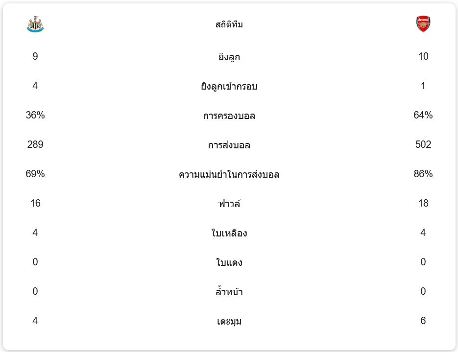 เกมนี้ อาร์เซนอล ครองบอลได้ถึง 64% และมีการส่งบอลทั้งหมด 502 ครั้ง ขณะที่ นิวคาสเซิ่ล ครองบอลเพียง 36% และส่งบอลได้ 289 ครั้ง แม้ว่าผู้มาเยือนจะยิงเข้ากรอบได้เพียงครั้งเดียวจาก 10 ครั้งที่ยิงทั้งหมด ขณะที่ นิวคาสเซิ่ล ยิงเข้ากรอบ 4 ครั้งจากทั้งหมด 9 ครั้ง การฟาวล์เกิดขึ้นค่อนข้างบ่อย โดยทั้งสองทีมมีใบเหลืองทีมละ 4 ใบ