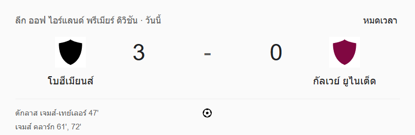 - หมดเวลา: โบฮีเมียนส์ เปิดบ้านถล่ม กัลเวย์ ยูไนเต็ด 3-0 เก็บสามแต้มสุดสำคัญ