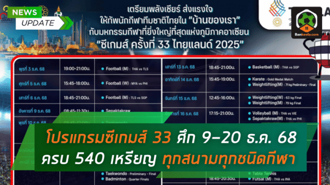 โปรแกรมซีเกมส์ 33 ระเบิดศึก 9-20 ธ.ค. 68 เช็กครบ 540 เหรียญ ทุกสนาม ทุกชนิดกีฬา แฟนไทยห้ามกระพริบตา