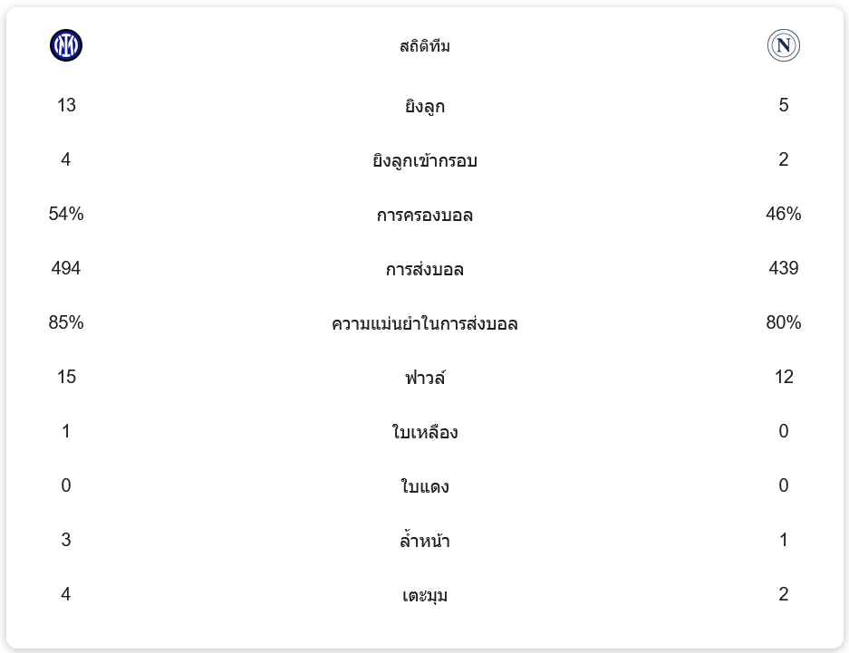อินเตอร์ครองบอลได้มากกว่า 54% มีการส่งบอลทั้งหมด 494 ครั้ง ส่วนทางด้านนาโปลีครองบอล 46% แต่มีความแม่นยำในการส่งบอลถึง 80% อินเตอร์ยิงเข้ากรอบ 4 ครั้ง ขณะที่นาโปลียิงเข้ากรอบ 2 ครั้ง