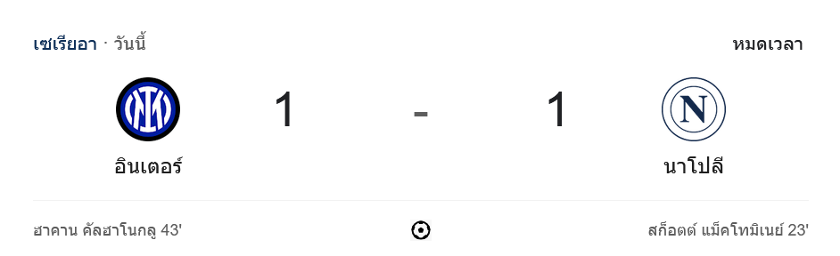 การแข่งขันฟุตบอล เซเรียอา 2024 ในเกมระหว่าง อินเตอร์ มิลาน และ นาโปลี จบลงด้วยผลเสมอ 1-1 แบบเข้มข้นสุดมันส์ โดยในครึ่งแรก นาโปลีเริ่มต้นได้ดีและเป็นฝ่ายขึ้นนำไปก่อนจากการยิงของ สก็อตต์ แม็คโทมิเนย์ ในนาทีที่ 23 ทำให้ทีมเยือนออกนำ 0-1 หลังจากนั้น อินเตอร์ไม่ยอมแพ้ พยายามเปิดเกมบุกและตีเสมอได้จากการยิงฟรีคิกของ ฮาคาน คัลฮาโนกลู ในนาทีที่ 43 ทำให้จบครึ่งแรกด้วยสกอร์ 1-1