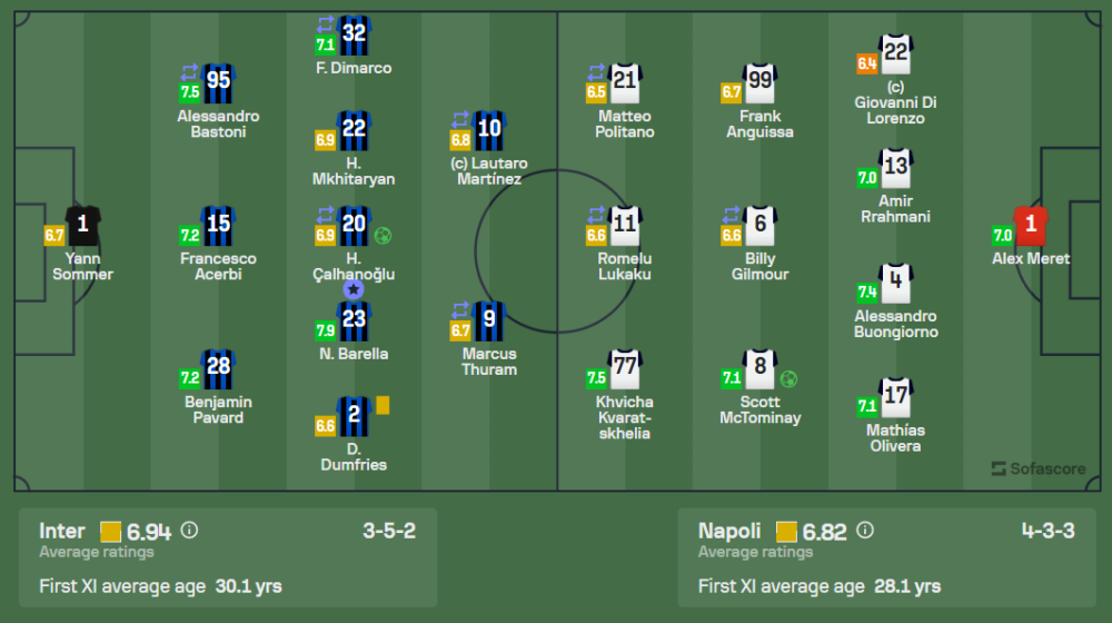- กองหน้า: ควิชา ควารัตสเคเลีย (7.5), โรเมลู ลูกากู (6.6)