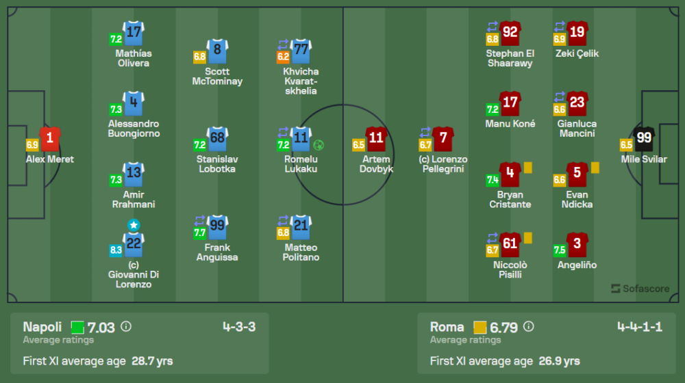 นาโปลีใช้ระบบ 4-3-3 เพื่อเพิ่มประสิทธิภาพเกมรุกผ่านทางปีกขวาที่มี โจวานนี่ ดิ ลอเรนโซ และ มาเตโอ โปลิตาโน่ ที่ประสานงานกันได้ยอดเยี่ยม ส่งผลให้โอกาสทำประตูเกิดขึ้นบ่อยครั้ง โดยเฉพาะจังหวะลูกตั้งเตะที่เป็นจุดเด่น ในขณะเดียวกัน โรม่าเลือกใช้ระบบ 4-4-1-1 ซึ่งเน้นการเล่นเกมรับและรอโอกาสสวนกลับผ่านความเร็วของ สเตฟาน เอล ชาราวี และ อาร์เต็ม ดอฟบิค แต่ไม่สามารถทำลายแนวรับอันเหนียวแน่นของนาโปลีได้ การขาดความหลากหลายในเกมรุกทำให้โอกาสจบสกอร์มีน้อยมาก