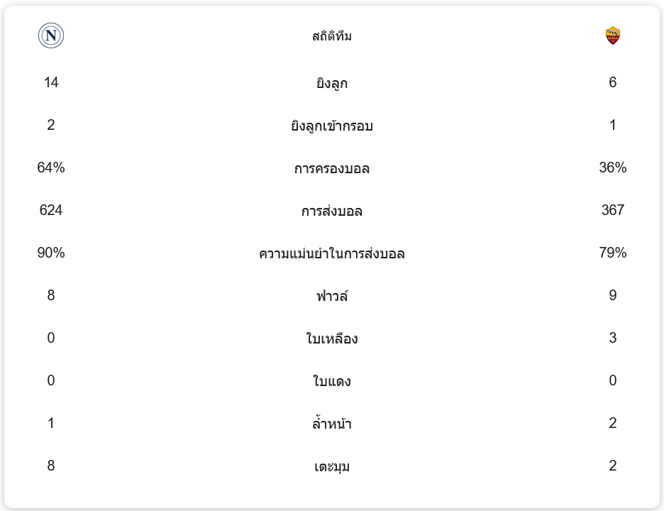 นาโปลีมีการครองบอลมากถึง 64% และจ่ายบอลแม่นยำ 90% ขณะที่โรม่า ครองบอลเพียง 36% และยิงเข้ากรอบเพียงครั้งเดียวจากทั้งหมด 6 ครั้ง แสดงให้เห็นถึงความแตกต่างในประสิทธิภาพเกมรุกและรับของทั้งสองทีม