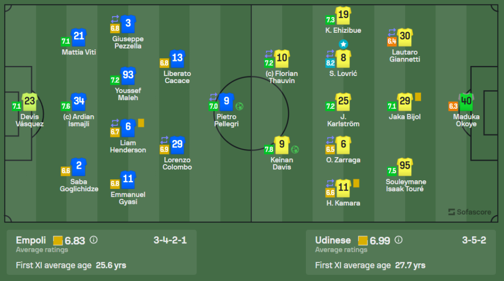 เอ็มโปลีใช้ระบบ 3-4-2-1 ซึ่งเน้นการตั้งรับลึกและสวนกลับเร็ว แต่ยังขาดความต่อเนื่องในการสร้างโอกาสบุก ขณะที่อูดิเนเซ่เล่นด้วยระบบ 3-5-2 ที่เน้นครองบอลในแดนกลาง โดยมี ซานดี้ โลฟริค เป็นจุดเชื่อมเกมสำคัญ การบุกของอูดิเนเซ่ดูมีประสิทธิภาพกว่า แต่ความเด็ดขาดยังไม่เพียงพอที่จะคว้าชัย