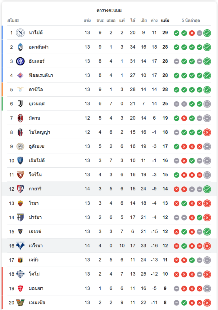 กาญารี่เก็บเพิ่มเป็น 14 คะแนน ขึ้นมาอยู่อันดับที่ 12 ของตาราง ขณะที่เวโรน่าหล่นไปอยู่อันดับ 16 มีเพียง 12 คะแนนจาก 14 นัด