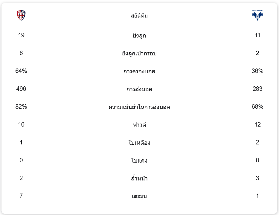 กาญารี่ครองบอลได้ถึง 64% มีโอกาสยิง 19 ครั้ง เข้ากรอบ 6 ครั้ง ขณะที่เวโรน่าครองบอลเพียง 36% ยิง 11 ครั้ง เข้ากรอบ 2 ครั้ง ความแม่นยำในการจ่ายบอลของเจ้าบ้านอยู่ที่ 82% ซึ่งสูงกว่าทีมเยือนที่มีเพียง 68% และเจ้าบ้านได้เตะมุมถึง 7 ครั้ง เทียบกับเวโรน่าที่ได้เพียง 1 ครั้ง