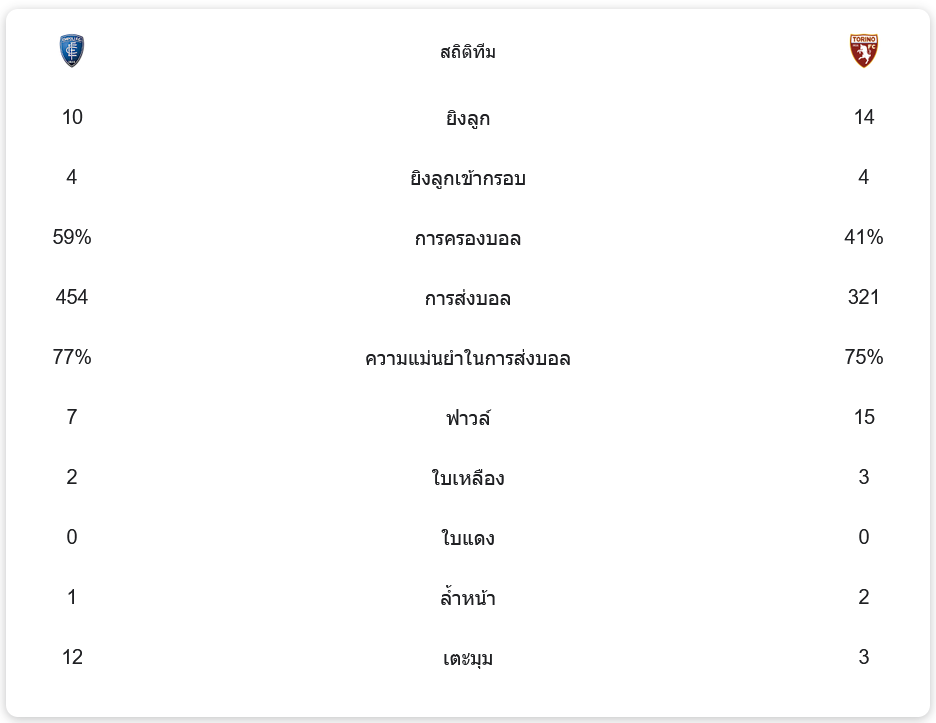 โตริโน่มีโอกาสยิง 14 ครั้ง เท่ากับเอ็มโปลี แต่ความแม่นยำในการเข้ากรอบเท่ากันที่ 4 ครั้ง การครองบอลของเอ็มโปลีเหนือกว่าที่ 59% แต่การจบสกอร์ไม่เฉียบคมเหมือนโตริโน่ที่ใช้โอกาสได้อย่างมีประสิทธิภาพ