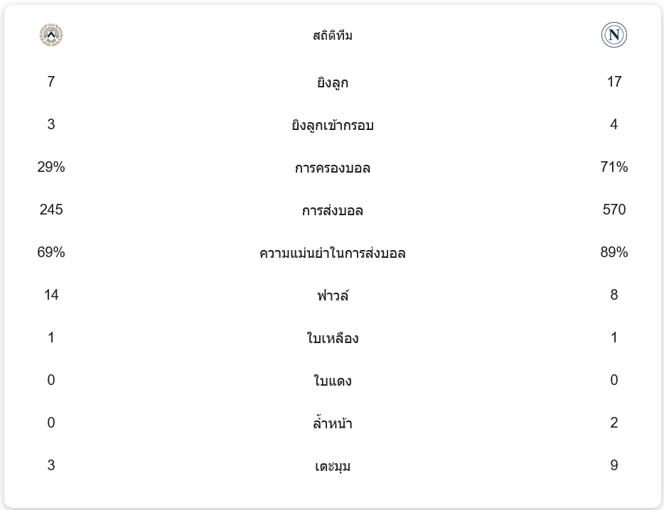 นาโปลี ครองบอลได้มากถึง 71% เทียบกับ อูดิเนเซ่ ที่มีเพียง 29% ทีมเยือนยิงทั้งหมด 17 ครั้ง โดยเข้ากรอบ 4 ครั้ง ส่วน อูดิเนเซ่ ยิงเพียง 7 ครั้ง และเข้ากรอบ 3 ครั้ง