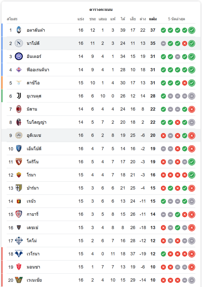 นาโปลี ขยับขึ้นมาเป็นรองจ่าฝูง มี 35 คะแนนจาก 16 นัด ขณะที่ อูดิเนเซ่ รั้งอันดับ 9 ด้วย 20 คะแนน