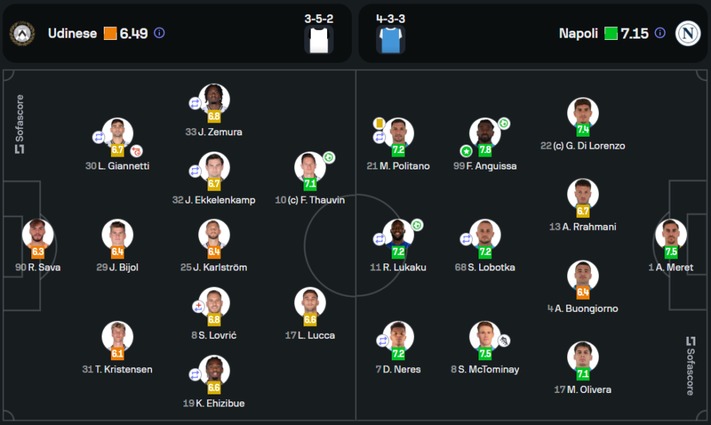 นาโปลี ยังคงใช้แผน 4-3-3 ที่เน้นความเร็วในเกมรุกด้วยการวิ่งตัดหลังกองหลังอูดิเนเซ่ โรเมลู ลูกากู ทำหน้าที่กดดันเซ็นเตอร์แบ็กคู่แข่งได้อย่างยอดเยี่ยม และ ฟร้องค์ อ็องกิสซา คุมแดนกลางช่วยให้เกมบุกของ นาโปลี มีความหลากหลาย ขณะที่ อูดิเนเซ่ เน้นตั้งรับและใช้การสวนกลับเร็ว แต่ไม่สามารถสร้างโอกาสยิงประตูได้มากพอ