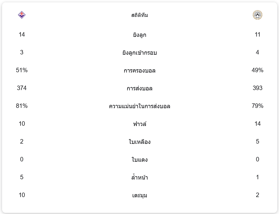 ฟิออเรนติน่าครองบอลได้มากกว่าเล็กน้อย (51%) และยิง 14 ครั้ง แต่เข้ากรอบเพียง 3 ครั้ง ขณะที่อูดิเนเซ่ยิง 11 ครั้ง เข้ากรอบ 4 ครั้ง เกมนี้ยังมีการทำฟาวล์รวม 24 ครั้งและแจกใบเหลืองถึง 7 ใบ แสดงถึงความดุเดือดของทั้งสองทีม
