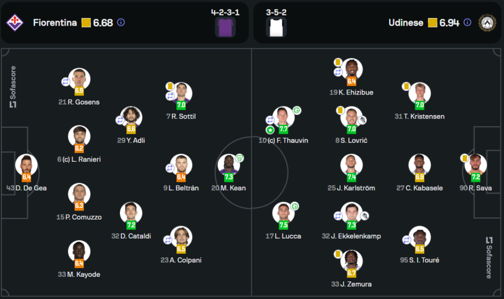 ฟิออเรนติน่าเน้นการครองบอลเป็นหลัก ด้วยระบบ 4-2-3-1 ที่มีมิดฟิลด์ตัวรุกคอยสร้างเกมรุก ขณะที่อูดิเนเซ่ใช้ระบบ 3-5-2 เน้นการสวนกลับที่มีความเร็วสูงและแม่นยำ การเปลี่ยนตัวของอูดิเนเซ่ในครึ่งหลังเปลี่ยนโฉมเกมได้ชัดเจน โดยการแอสซิสต์และการยิงที่เด็ดขาดของนักเตะตัวหลักอย่าง ลูคค่า และ โตแว็ง ช่วยให้ทีมคว้าชัยชนะ