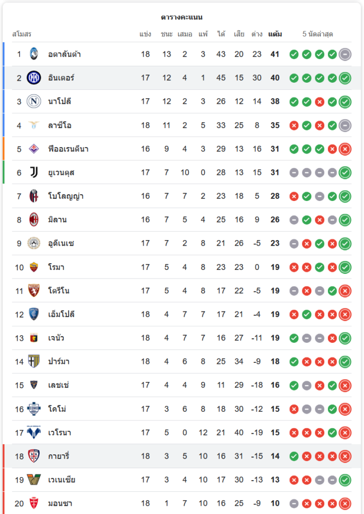 อินเตอร์ มิลาน เก็บเพิ่ม 3 คะแนน ขยับขึ้นมาอยู่ในอันดับ 2 ของตาราง มี 40 คะแนน ห่างจากจ่าฝูงเพียง 1 แต้ม ขณะที่กาญารี่ยังคงรั้งอันดับ 18 ต้องดิ้นรนต่อไปในการหนีโซนตกชั้น