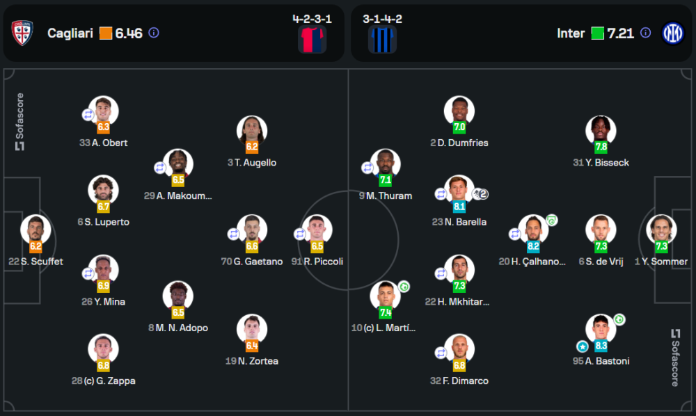 - กองกลาง: เดนเซล ดุมฟรีส์ (7.0), ฮาคาน ชัลฮาโนกลู (8.2), นิโคโล บาเรลลา (8.1), เฮนริกห์ มคิตาร์ยาน (7.4), เฟเดริโก ดิมาร์โก (6.8)