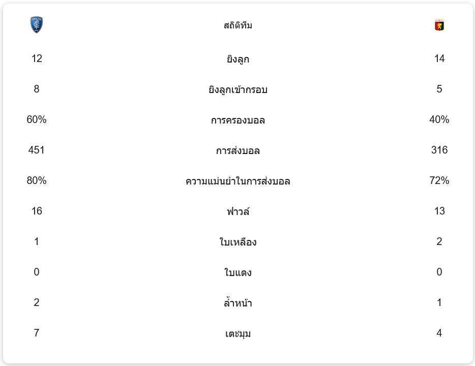 เอ็มโปลีมีโอกาสยิงทั้งหมด 12 ครั้ง ขณะที่เจนัวมี 14 ครั้ง การครองบอลของเอ็มโปลีสูงถึง 60% เทียบกับเจนัวที่ครองบอล 40% แต่เจนัวมีความแม่นยำในจังหวะจบสกอร์มากกว่า