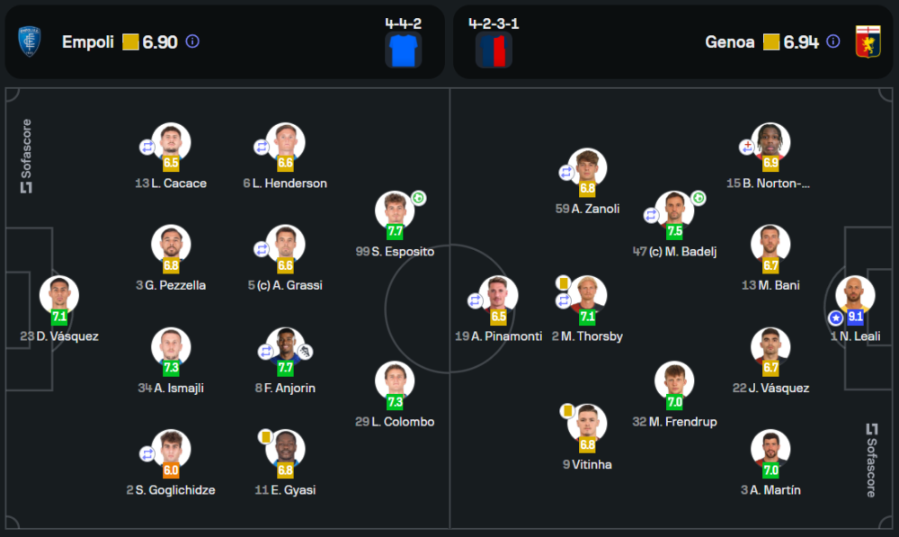 กองหลัง: ดิมิเทรียส วาสเกซ (7.1), จาโคโป เซกเกตติ (6.6), อาร์เดียน อิสไมจิ (7.3), ลูกา เคเซ (6.5)