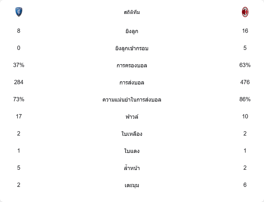 เกมนี้ มิลานครองบอลถึง 63% และผ่านบอลแม่นยำถึง 86% เทียบกับเอ็มโปลีที่ทำได้เพียง 73% ทีมเยือนสร้างโอกาสยิง 16 ครั้ง และเข้ากรอบ 5 ครั้ง ขณะที่เจ้าถิ่นยิงเพียง 8 ครั้ง แต่ไม่เข้ากรอบเลย