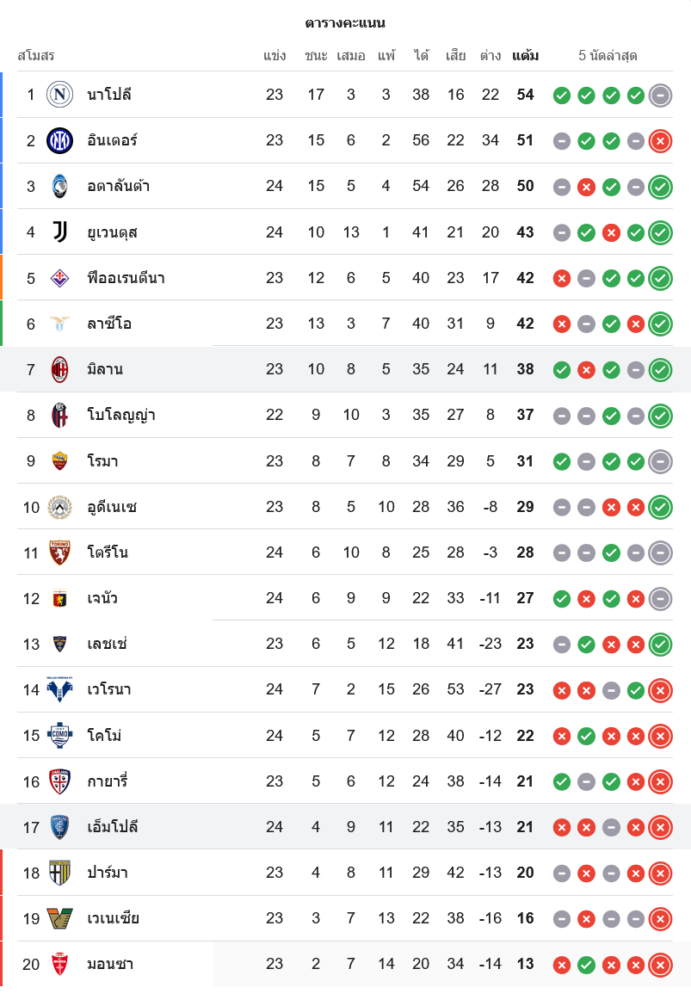 มิลาน ขยับขึ้นมาอยู่อันดับ 7 มี 38 คะแนน ไล่จี้อันดับ 5 และ 6 อย่างฟิออเรนติน่าและลาซิโอที่มี 42 คะแนน ขณะที่ เอ็มโปลี ยังอยู่โซนตกชั้น อันดับ 17 มีเพียง 21 คะแนน