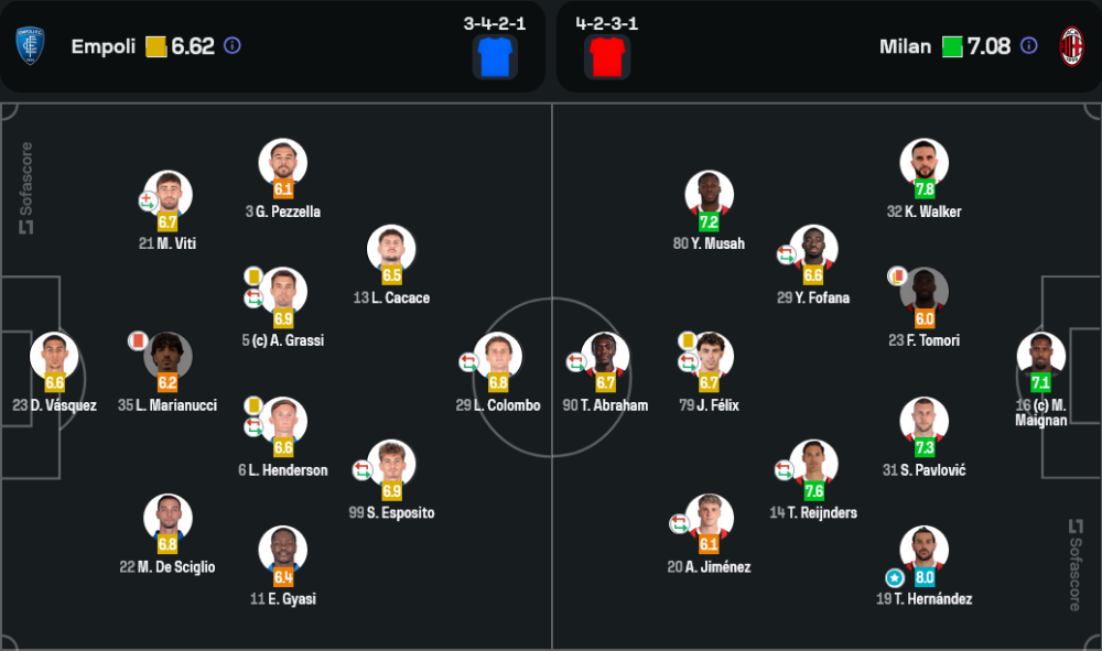 เอซี มิลาน ใช้แผน 4-2-3-1 โดยมี แทมมี่ อับราฮัม เป็นหน้าเป้า สนับสนุนโดย เชา เฟลิกซ์, ยูนุส มูซาห์ และ ยุสซูฟ โฟฟาน่า ขณะที่ เอ็มโปลี มาในระบบ 3-4-2-1 ตั้งรับลึกและเน้นเกมโต้กลับ