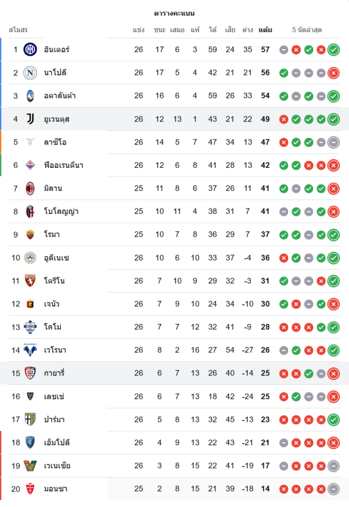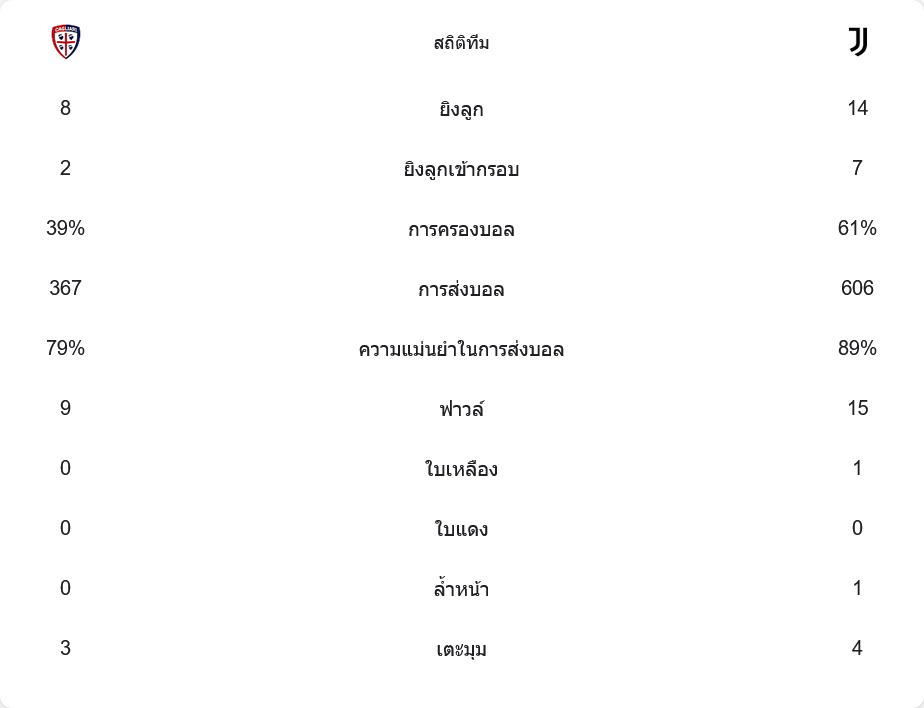 สถิติการแข่งขัน – ยูเวนตุสคุมเกมเหนือกว่า กาญารี่ขาดความเฉียบคม