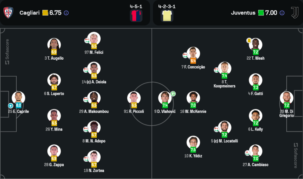 กาญารี่ มาในระบบ 4-5-1 เน้นแพ็คแดนกลางแน่น แต่ขาดตัวจบสกอร์ที่เฉียบขาด ขณะที่ ยูเวนตุส วางระบบ 4-2-3-1 ใช้ วลาโฮวิช เป็นหน้าเป้าและมี ยิลดิซ คอยปั้นเกม จุดสำคัญคือเกมรับของทีมม้าลายที่แข็งแกร่ง ทำให้กาญารี่มีโอกาสยิงน้อยมาก การสวนกลับของยูเวนตุสยังเป็นอาวุธสำคัญ และการเปลี่ยนตัวส่ง เอ็มบังกูล่า ลงมาเพิ่มความเร็วช่วงท้ายเกมช่วยปิดเกมได้อย่างยอดเยี่ยม