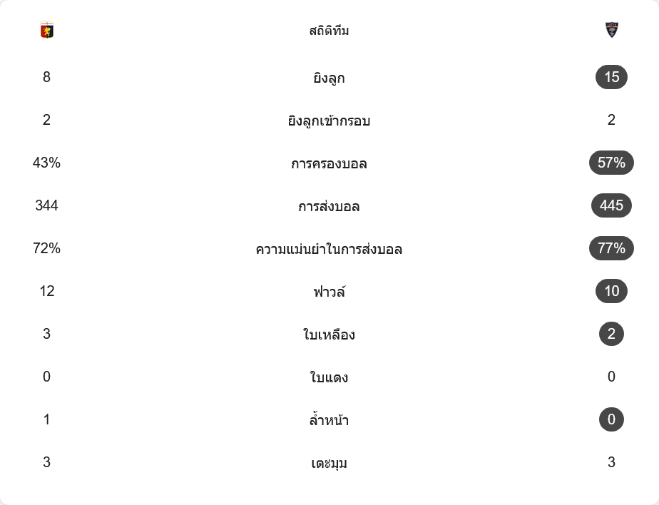 แม้ว่า เลชเช่ จะครองบอลมากกว่าถึง 57% และมีโอกาสยิงมากกว่า เจนัว (15 ต่อ 8 ครั้ง) แต่พวกเขายิงเข้ากรอบเพียง 2 ครั้งเท่านั้นเท่ากับเจ้าบ้าน ความแม่นยำในการผ่านบอลของ เลชเช่ อยู่ที่ 77% ขณะที่ เจนัว อยู่ที่ 72% ส่วนการทำฟาวล์ เจนัว ฟาวล์ไป 12 ครั้ง ได้ใบเหลือง 3 ใบ ส่วน เลชเช่ ฟาวล์ไป 10 ครั้ง ได้ใบเหลือง 2 ใบ