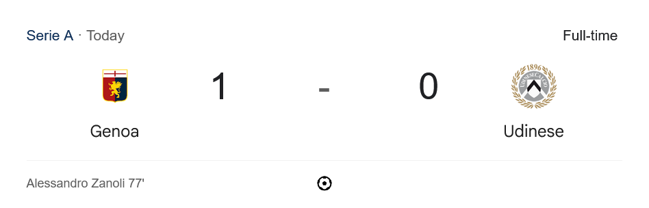 จากนั้น อูดิเนเซ่ พยายามโหมบุกเพื่อหวังทำประตูตีเสมอ แต่เกมรับของ เจนัว ยังคงยืนหยัดอย่างแข็งแกร่งจนกระทั่งสิ้นเสียงนกหวีดสุดท้าย จบเกม เจนัว เอาชนะไปได้ด้วยสกอร์ 1-0 เก็บสามแต้มสำคัญไปครองอย่างสมศักดิ์ศรี