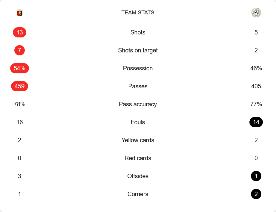 เกมนี้ เจนัว ครองบอลได้มากกว่าที่ 54% พร้อมการส่งบอลทั้งหมด 459 ครั้ง ด้วยความแม่นยำที่ 78% ขณะที่ อูดิเนเซ่ ทำการส่งบอล 405 ครั้ง และความแม่นยำ 77% โดยมีโอกาสยิงทั้งหมดเพียง 5 ครั้ง ตรงกรอบ 2 ครั้ง ต่างจาก เจนัว ที่มีโอกาสยิงถึง 13 ครั้ง ตรงกรอบ 7 ครั้ง