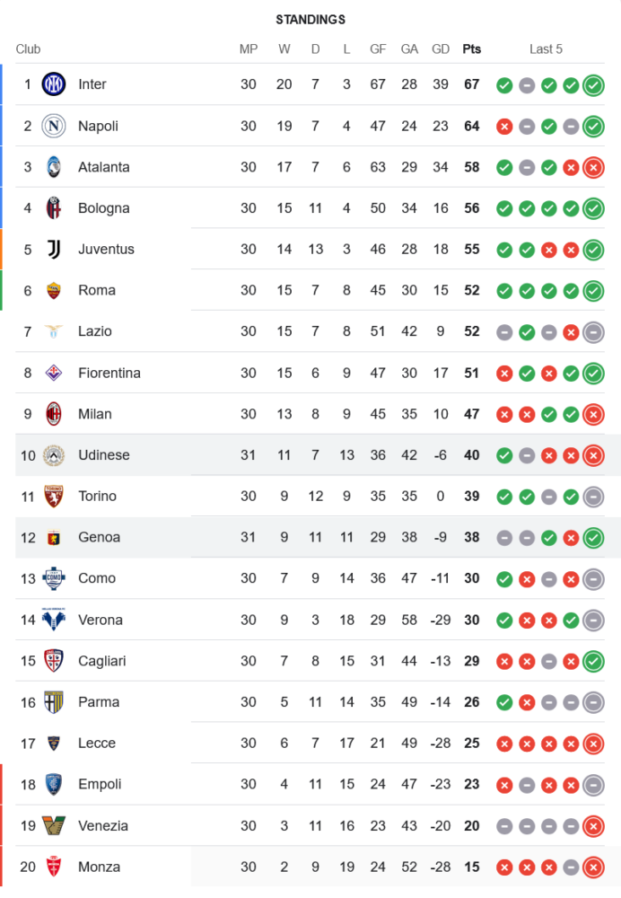 ชัยชนะในเกมนี้ทำให้ เจนัว มีคะแนนเพิ่มเป็น 38 คะแนน จาก 31 นัด อยู่ในอันดับที่ 12 ส่วน อูดิเนเซ่ ยังคงมี 40 คะแนน จาก 31 นัด อยู่ในอันดับที่ 10 ของตารางคะแนน