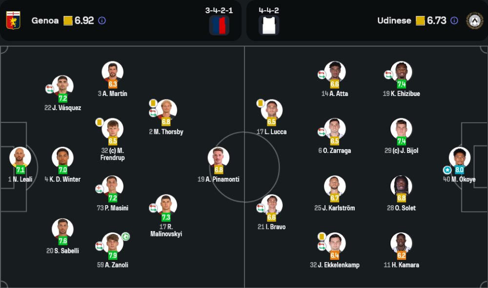 มาดูก้า โอโคเย่ ผู้รักษาประตูของ อูดิเนเซ่ ทำผลงานได้อย่างยอดเยี่ยม เซฟลูกยิงอันตรายหลายครั้ง และได้รับคะแนนสูงสุดในเกมนี้ที่ 8.0