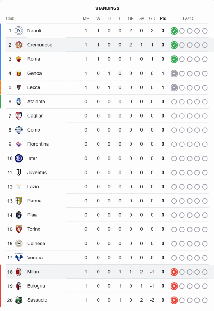 โปรแกรม ตารางบอล นัดถัดไป มิลานต้องเปิดบ้านพบโบโลญญาในวันที่ 15 กันยายน ขณะที่เครโมเนเซ่มีคิวบุกเยือนเวโรนา ถือเป็นสองเกมสำคัญที่ทั้งคู่ต้องการแต้มเพื่อเดินหน้าตามเป้าหมาย
