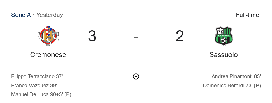 เข้าสู่ครึ่งหลังทีมเยือนปรับเกมทันที นาที 63 คริสเตียน โวลปาโต้ จ่ายทะลุให้ อันเดรีย ปินามอนติ ยิงตีไข่แตก 1-2 ความหวังกลับมา และในนาที 73 โดเมนิโก้ เบราร์ดี้ กดจุดโทษไม่พลาด ตีเสมอ 2-2 เกมเริ่มสนุกสูสี แต่ช่วงท้ายความดราม่าก็เกิดขึ้น เมื่อเครโมเนเซ่ได้จุดโทษนาที 90+3 มานูเอล เด ลูก้า ซัดเข้าไม่เหลือ จบเกมสุดมันส์ 3-2 ส่งเสียงเชียร์ลั่นสนามและขึ้นหัวตารางแบบเหลือเชื่อ