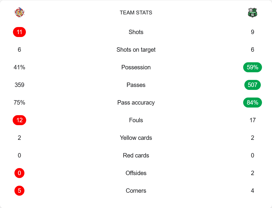 แม้ซัสเซาโล่ครองบอลมากกว่าที่ 59% จ่าย 507 ครั้ง ความแม่นยำสูงถึง 84% แต่เครโมเนเซ่เล่นคมกว่า ยิง 11 ครั้ง เข้ากรอบ 6 เท่ากับทีมเยือน และมีโอกาสจบสกอร์หวังผลชัดเจนกว่า ทั้งสองทีมฟาวล์เยอะ เครโมเนเซ่ 12 ครั้ง ซัสเซาโล่ 17 ครั้ง แจกใบเหลืองทีมละ 2 ไม่มีใบแดง เกมค่อนข้างสูสีแต่ความเฉียบคมเจ้าถิ่นกินขาด