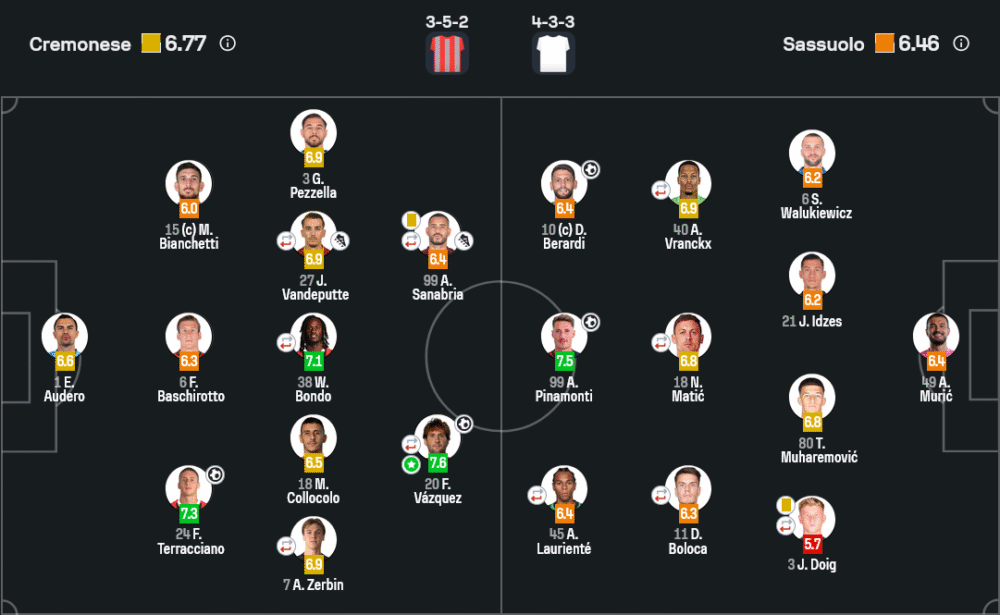 ฟรังโก วาซเกซ เพลย์เมกเกอร์เครโมเนเซ่ รับรางวัลแมนออฟเดอะแมตช์ เรตติ้ง 7.6 จากการยิง 1 แอสซิสต์ 1 คุมเกมรุกให้เจ้าถิ่นอย่างเหนือชั้น เป็นหัวใจสำคัญที่ทำให้ทีมเดินเกมได้ลื่นไหล