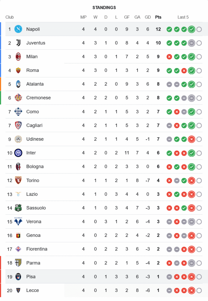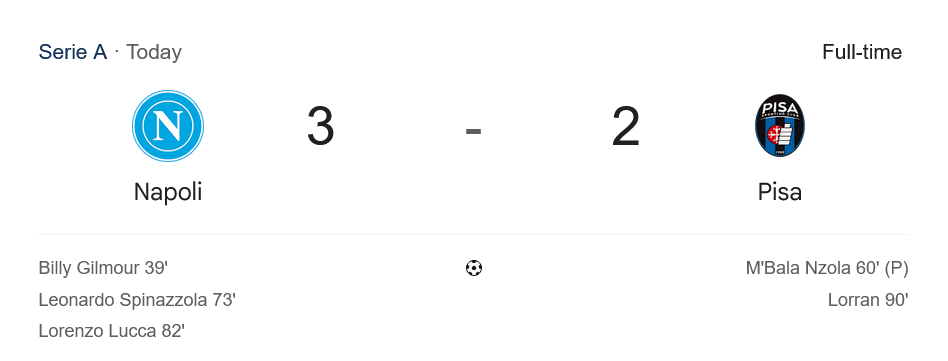 ชัยชนะเกมนี้ทำให้นาโปลีคว้า 12 แต้มเต็มจาก 4 นัด รั้งจ่าฝูงอย่างสง่างาม เหนือยูเวนตุสที่มี 10 แต้ม ส่วนปิซ่ายังจมโซนแดงอันดับ 19 มีเพียง 1 แต้มจาก 4 นัด เกมถัดไปพวกเขาต้องเจอกับฟิออเรนติน่าในลีก ซึ่งถือว่ากดดันต่อเนื่อง