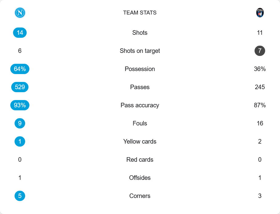 ตลอด 90 นาที นาโปลีครองบอล 64% ทำการจ่าย 529 ครั้ง ความแม่นยำ 93% สร้างโอกาสยิง 14 ครั้ง เข้ากรอบ 6 ส่วนปิซ่าได้ครองบอลเพียง 36% ยิง 11 ครั้ง เข้ากรอบ 7 แต่จังหวะจบสกอร์ยังไม่เด็ดขาด นอกจากนี้ปิซ่าทำฟาวล์ถึง 16 ครั้ง และได้ใบเหลือง 2 ขณะที่นาโปลีคุมเกมได้ดีกว่า แม้จะเจอความกดดันท้ายเกมแต่ยังปิดจ็อบสำเร็จ