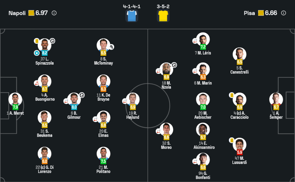 ด้านปิซ่า อัลแบร์โต้ จิลาร์ดิโน่ เลือกใช้ 3-5-2 ตั้งรับแน่นแล้วรอสวนกลับ จุดเด่นคือการใช้ความแข็งแกร่งของเอ็นโซล่ากับเลริสคอยปั่นป่วนแดนหลังนาโปลี แต่จังหวะเข้าทำยังไม่คมพอ การเสียสมาธิช่วงท้ายเกมทำให้ทีมต้องจบแบบมือเปล่า หากมองเชิง วิเคราะห์บอล ถือว่านาโปลีมีความครบเครื่องมากกว่า ทั้งเกมรุกที่ไหลลื่นและเกมรับที่เหนียวแน่น