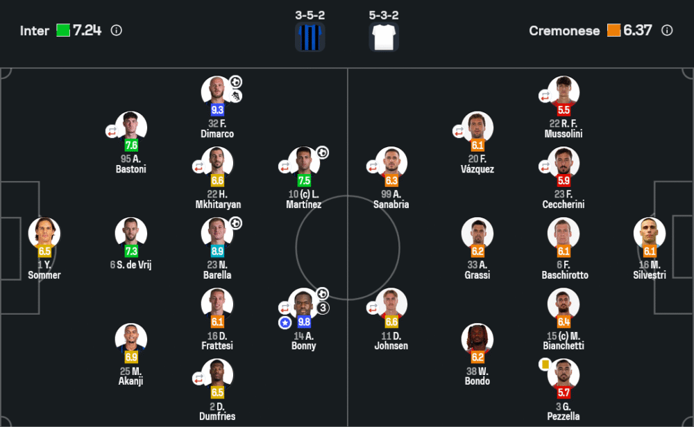 - กองกลาง: เดนเซล ดัมฟรีส์ (6.5), นิโคโล่ บาเรลล่า (8.9), ดาวิเด้ ฟรัตเตซี่ (6.1), เฮนริค มคิตาร์ยาน (6.6), เฟเดริโก ดิ มาร์โก้ (9.3)