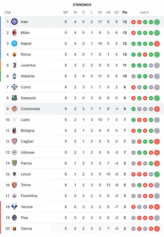 หลังเก็บชัยชนะนัดนี้ อินเตอร์ มิลาน เก็บเพิ่มเป็น 12 คะแนน จาก 6 นัด มีผลต่างประตูได้เสีย +9 รั้งจ่าฝูงร่วมกับ เอซี มิลาน, นาโปลี และ โรม่า ขณะที่ เครโมเนเซ่ มี 9 คะแนน อยู่อันดับ 9 ยังต้องเร่งฟอร์มเพื่อไล่ตามกลุ่มบน