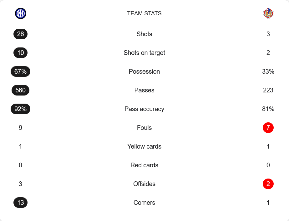 อินเตอร์ มิลานครองบอลถึง 67% สร้างโอกาสยิงมากถึง 26 ครั้ง เข้ากรอบ 10 ครั้ง ส่วนเครโมเนเซ่มีเพียง 3 ครั้งเท่านั้น การผ่านบอลของงูใหญ่แม่นยำถึง 92% เทียบกับคู่แข่งที่ 81% นอกจากนี้ยังได้ลูกเตะมุมถึง 13 ครั้ง สะท้อนเกมบุกที่ดุดัน ขณะที่ทีมเยือนยิงตรงกรอบเพียง 2 ครั้ง ตลอดทั้งเกม