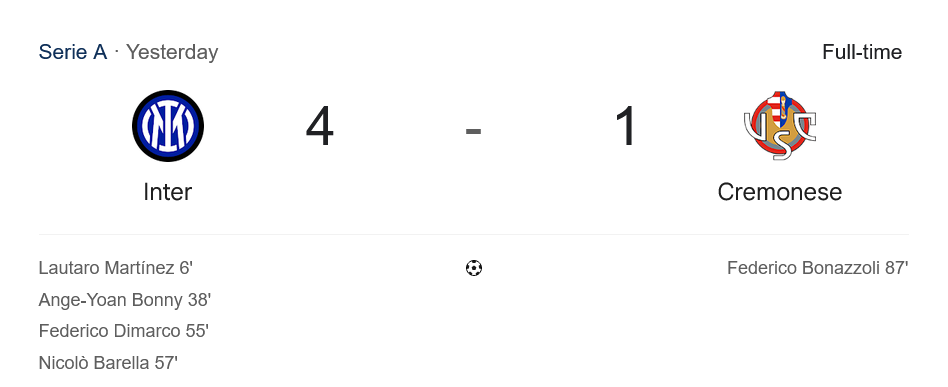 ช่วงท้ายเกมนาทีที่ 87 ทีมเยือน เครโมเนเซ่ ได้ประตูปลอบใจจาก เฟเดริโก้ โบนาซโซลี่ ก่อนหมดเวลา อินเตอร์ มิลาน ปิดเกมด้วยชัยชนะ 4-1 สุดแกร่ง